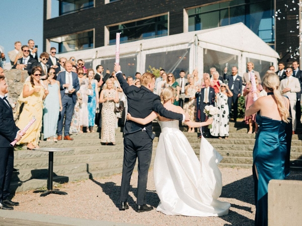 "Tusen tack för att ni gjorde vår bröllopsdag så fin! Vi är supernöjda med hur det blev med både mingel, dukning, middag och band/fest. Vi är så tacksamma och tyckte dagen var fantastisk! Hälsa er fina personal och tacka så mycket!"
