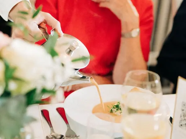 I vårt middagspaket ingår en mousserande välkomstdrink, förrätt, varmrätt och dessert. En halv flaska husets vita eller röda vin per person och kaffe samt lokalhyra, linne och servering, dukning och städning.