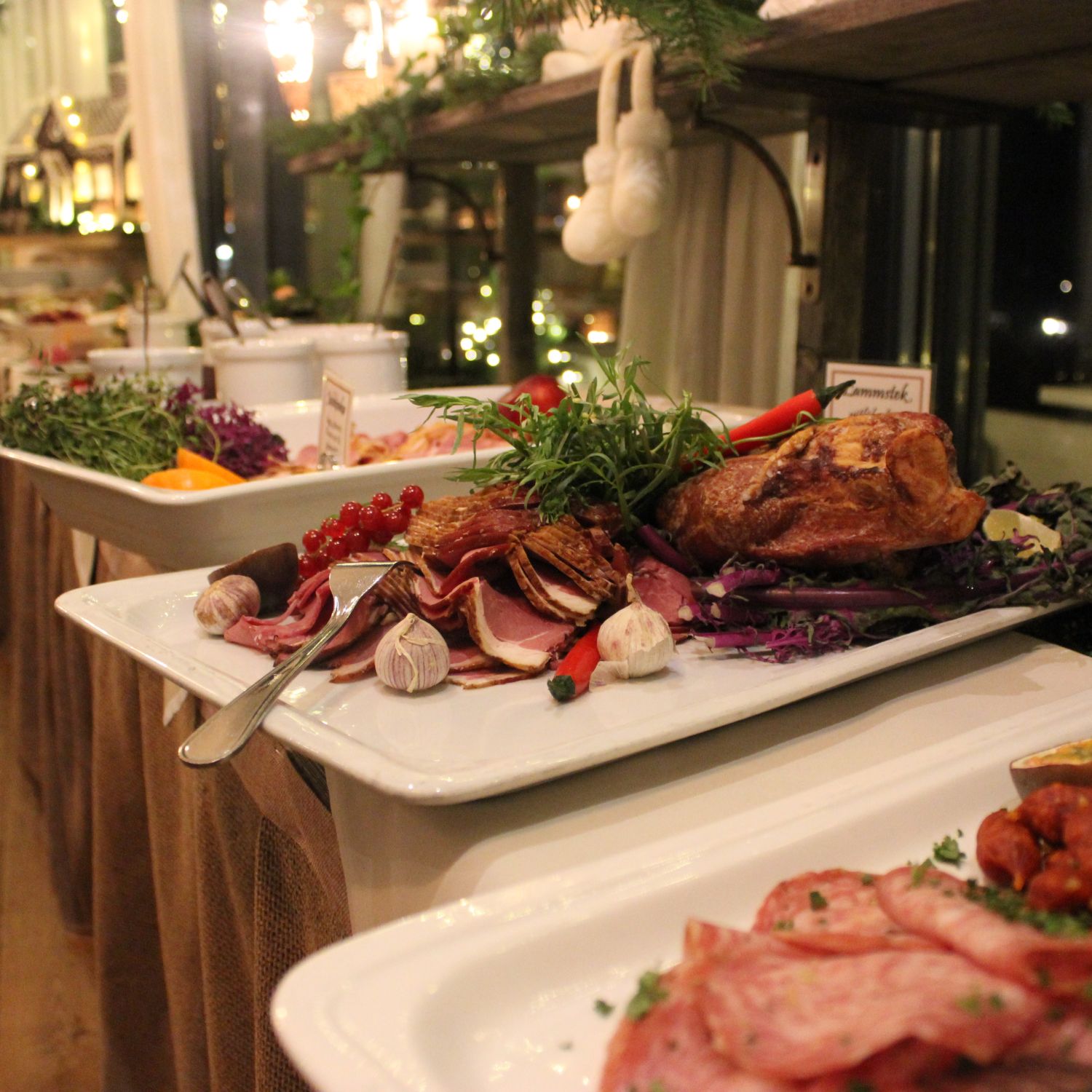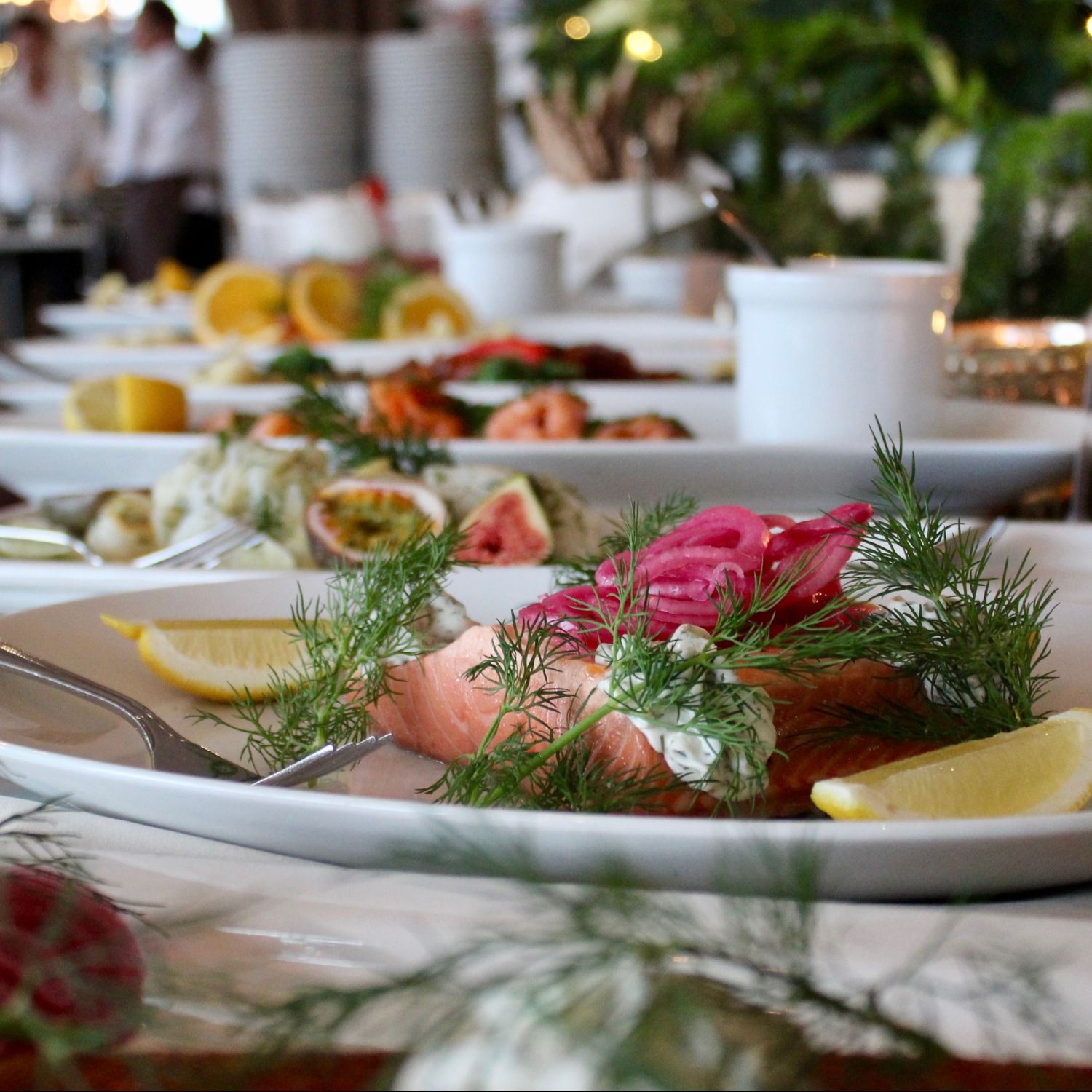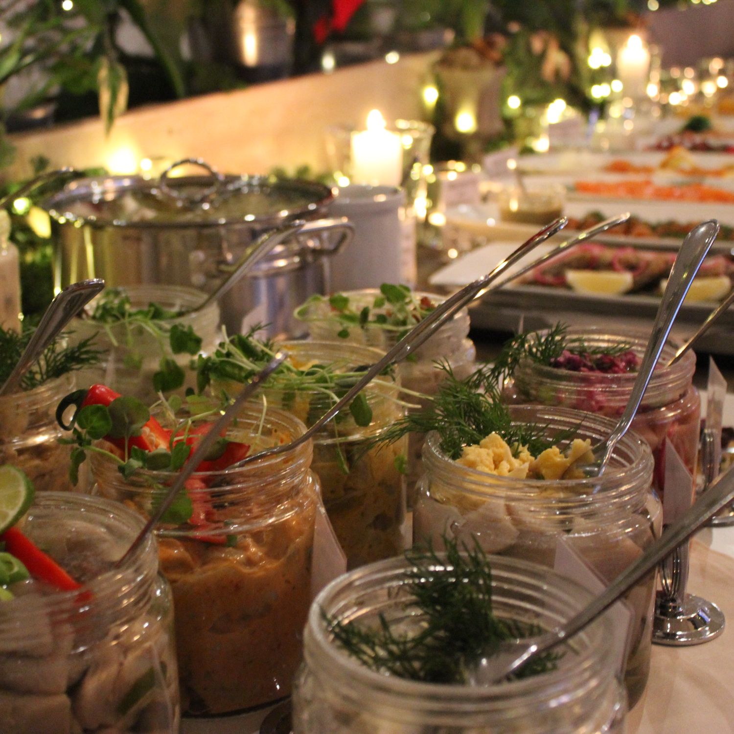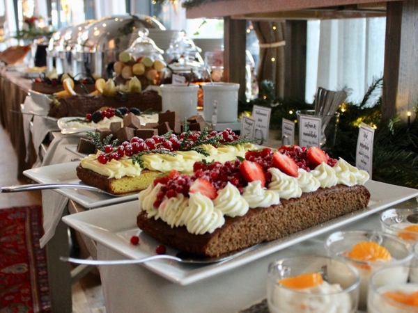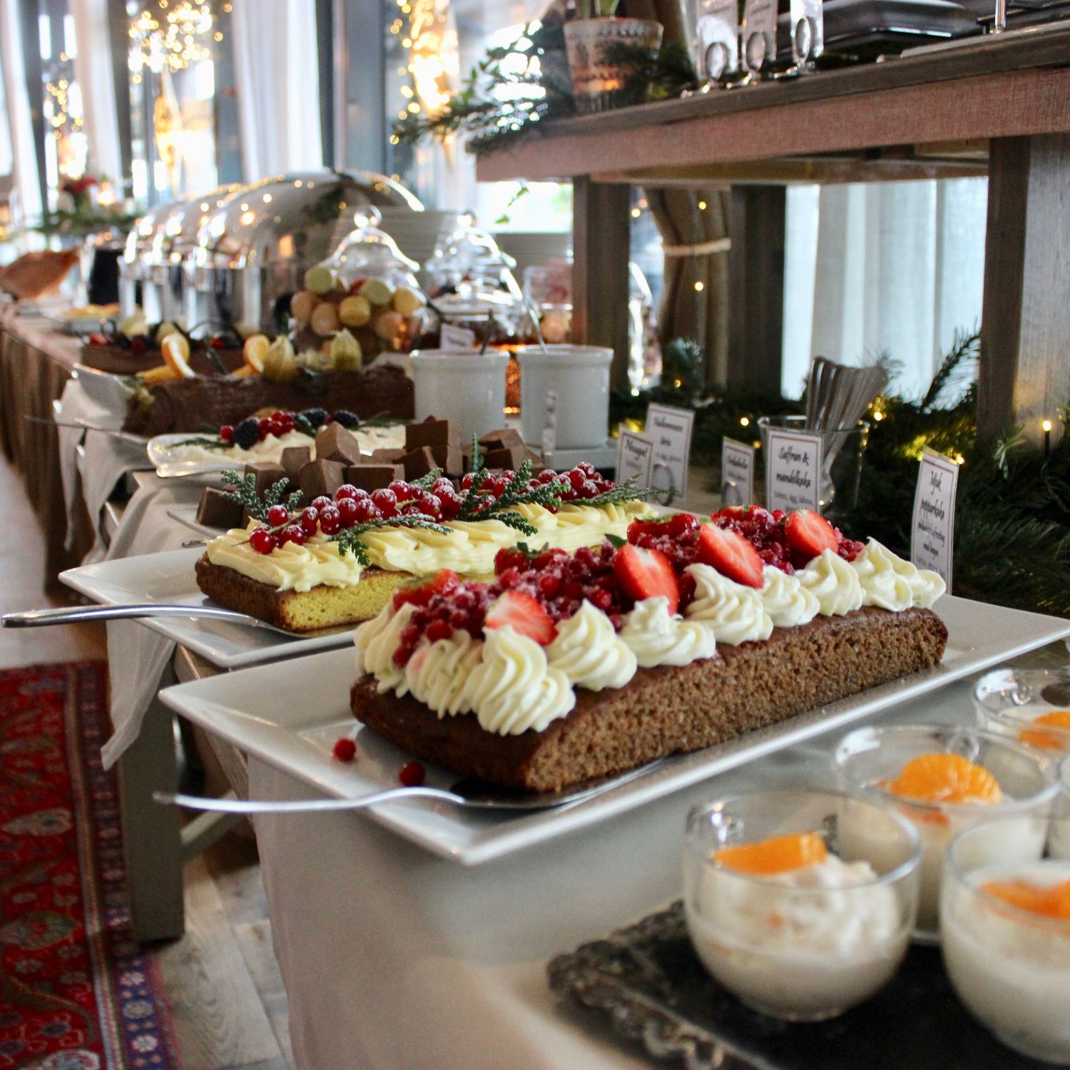 På julbordet hittar du flera sorters sill, lax i olika former, kallskuret samt goda klassiker som jansson, nykokt julskinka, prinskorv och hemlagade köttbullar. Middagen avrundas med ett stort dessertbord med hemlagade delikatesser.